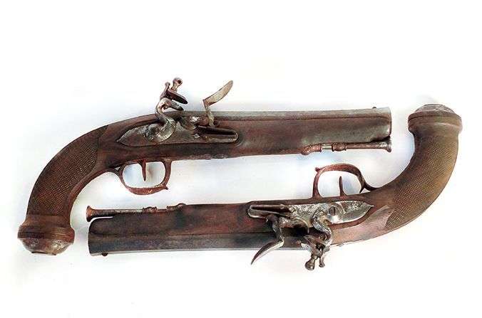 Paire de pistolets d'Officier, à silex. Canons à pans, évasés vers les bou