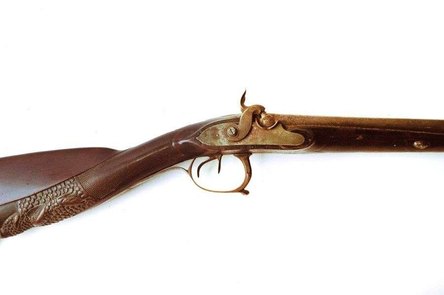 Fusil de chasse, double, à percussion. Canons en table. Crosse à joue, en noyer, sculpté d'une hure de sanglier.