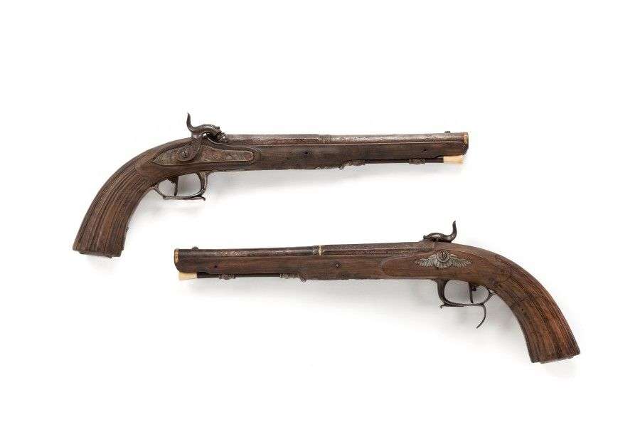 Pontets repose-doigt. Calottes marquées «Le Maréchal de Camp Comte de Roche-Chouard». Crosses en noyer, en partie sculptés et chiffrées sous couronne comtale. Baguettes en ébène, à embouts en ivoire. EM vers 1830 (usures, piqûres, manque un repose-doigt, cassure et fêles aux crosses)