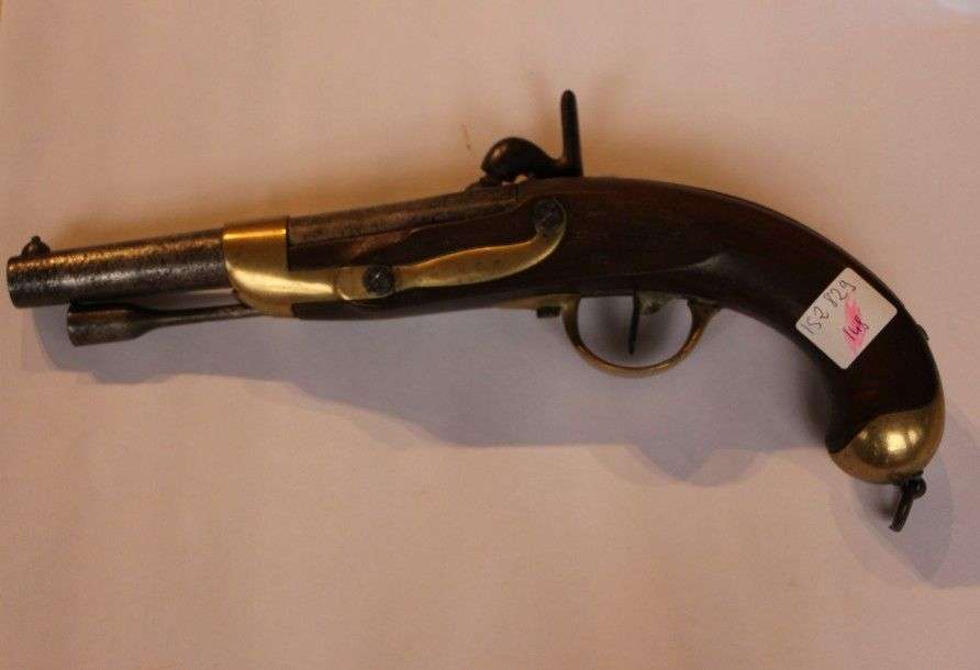 Pistolet d'arçon, modèle 1822 Tbis. Canon rond, à pans au tonnerre daté T1855. Platine maquée «Mre Impale de Châtellerault». Garnitures en laiton poinçonné. Crosse en noyer avec cachet. Baguette en fer. ABE (piqûres)
