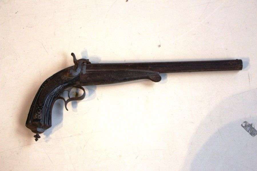Long pistolet de Vénerie, transformable en carabine, à broche. 1 coup, cal