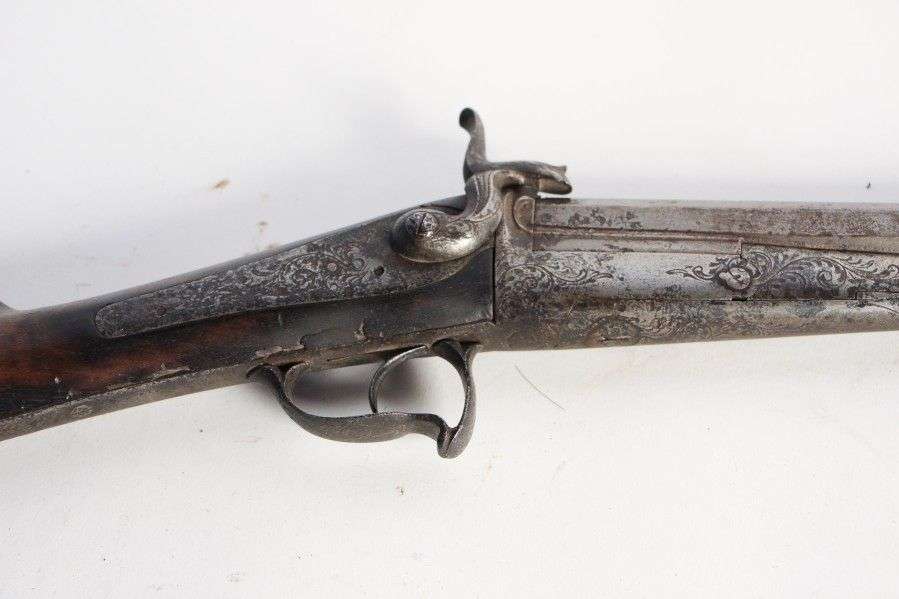 Fusil de chasse, à broche. 1 coup, calibre 16. Canon rond, à pans au tonnerre. Clef d'ouverture sous la longuesse. Bascule et platine, gravées. Crosse en noyer. Dans l'état vers 1870
