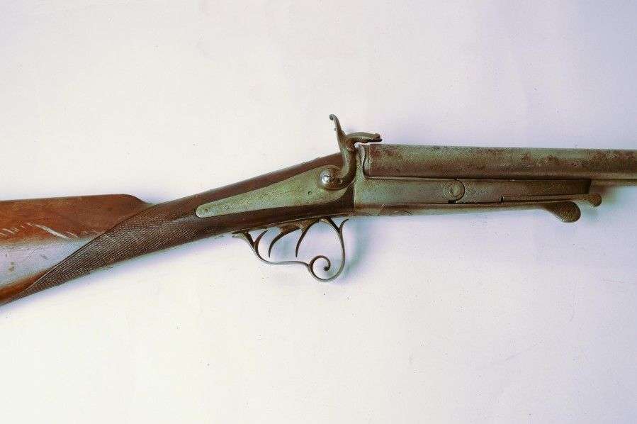 Fusil de chasse, double, à broche. Canons juxtaposés. Crosse en noyer. EM vers 1870