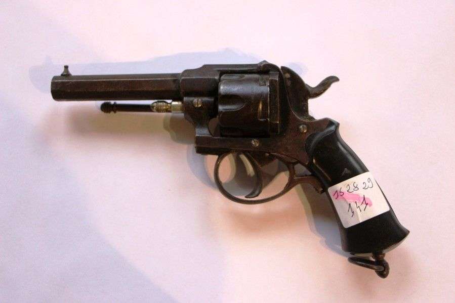 Revolver britannique. 6 coups, calibre.380''. Canon à pans. Carcasse et barillet évidé, bronzés. Détente sous pontet. Plaquettes de crosse en ébène. ABE vers 1880