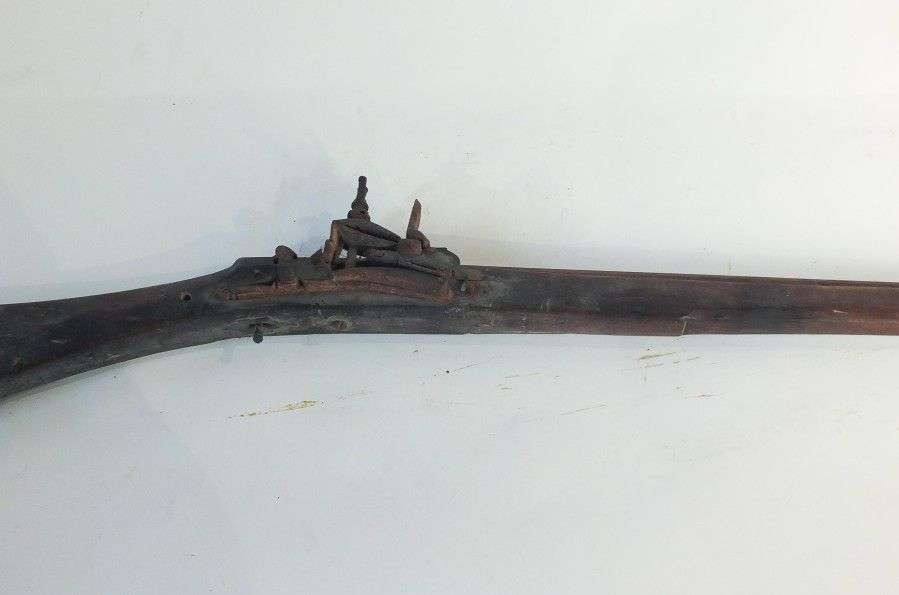 Grand fusil Marocain, à silex dit Moukalah. Canon à pans. Platine à la maurlaque. Crosse en bois à plaque de couche en fer. Dans l'état