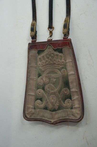 COIFFURES, UNIFORMES, ÉQUIPEMENT, DIVERS Sabretache d'Officier allemand. Plateau vert, chiffres «RFW» couronné et galons argentés. Corps en maroquin rouge. Avec ses trois suspentes en cuir, à boucles en laiton. ABE vers 1900 (accidents aux suspentes)
