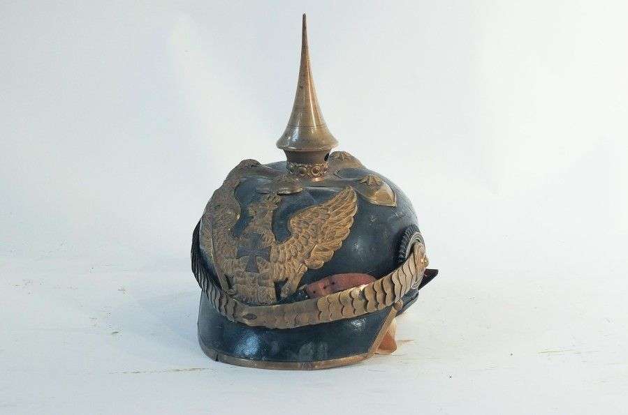 Casque à pointe d'Officier réserviste prussien. Bombe, visière, couvre-nuque en cuir. Pointe, plaque à l'aigle, garnitures et jugulaires à écailles en laiton. Cocardes tricolores. Coiffe intérieure en cuir et soie. ME