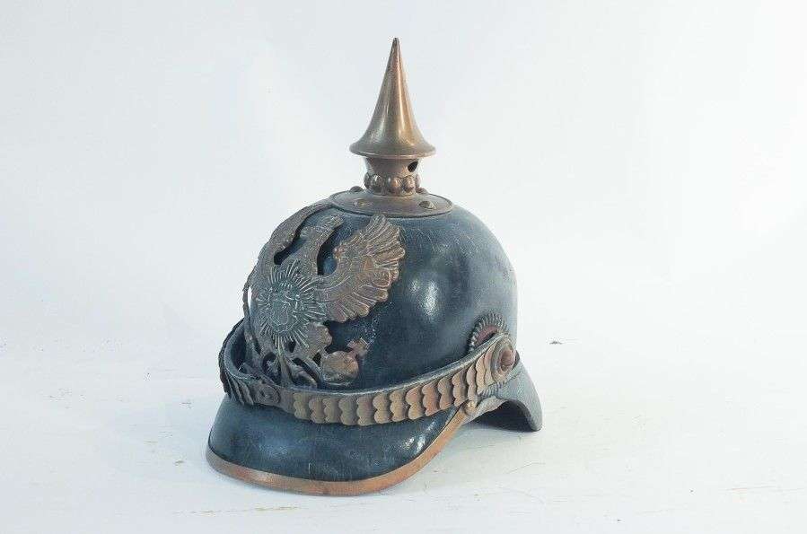 Casque à pointe oldenbourgeois. Bombe, visière et couvre-nuque en cuir. Pointe, plaque à l'aigle aux armes rapportées, garnitures et jugulaires à écailles en laiton. Cocardes tricolores. Coiffe intérieure en cuir. EM