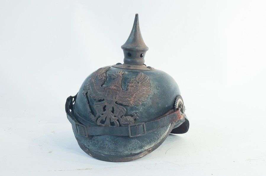 Casque à pointe prussien, modèle 1915. Bombe, visière et couvre-nuque en cuir. Pointe, plaque et garnitures en fer. Cocarde métallique prussienne. Jugulaire et coiffe intérieure en cuir. Dans l'état