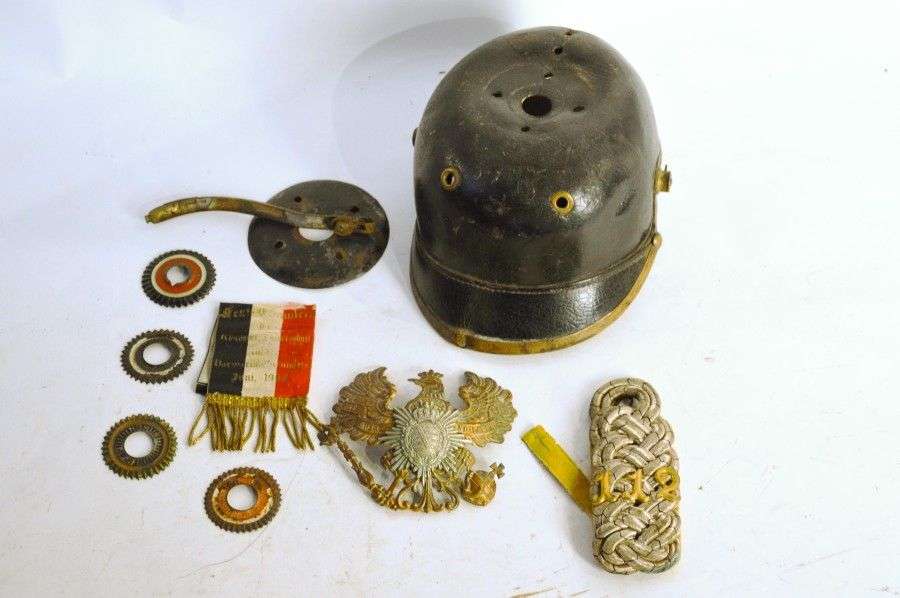 Lot: bombe de casque à pointe, quatre cocardes, plaque, patte d'épaule d'O