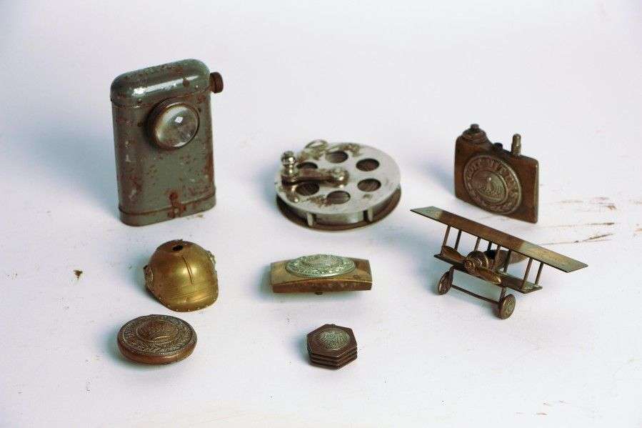 Lot allemand: lampe, 3 briquets patriotiques, casque à pointe miniature (manque la pointe), avion fabriqué à partir d'un étui, dessus de boîte et mètre ruban