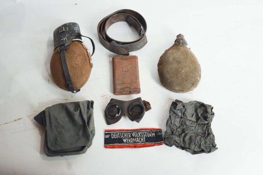 Lot: bidon modèle 1931 avec son quart, bidon modèle 1893, porte-cartouche de masque à gaz, housse en toile cirée, nécessaire de nettoyage, paire de lunettes en cuir, brassard, ceinturon avec son plateau. EM