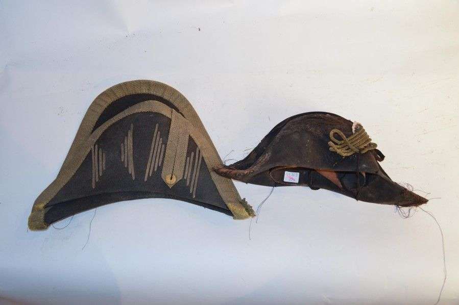 Lot de deux bicornes, en taupé noir. Galon, ganses dorés. Dans l'état