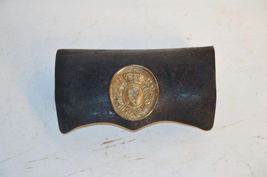 Coffret de giberne, en cuir noir. Motif en laiton aux Armes de France sur
