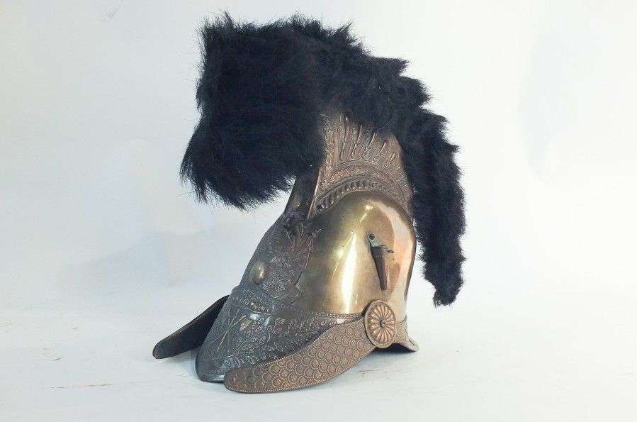 Casque à cimier de Sapeurs Pompiers d'Aouste, modèle 1821. Cimier, bombe,