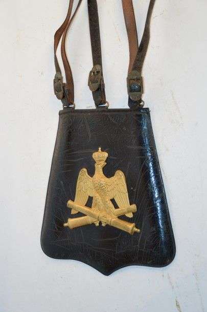 Sabretache d'Officier d'Artillerie, en cuir noir vernis. Motif aux Canons croisés surmontés de l'aigle couronnée en laiton doré. Intérieur en maroquin et velours bleu. Avec ses trois suspentes en cuir, à boucles en laiton. ABE Époque IInd Empire
