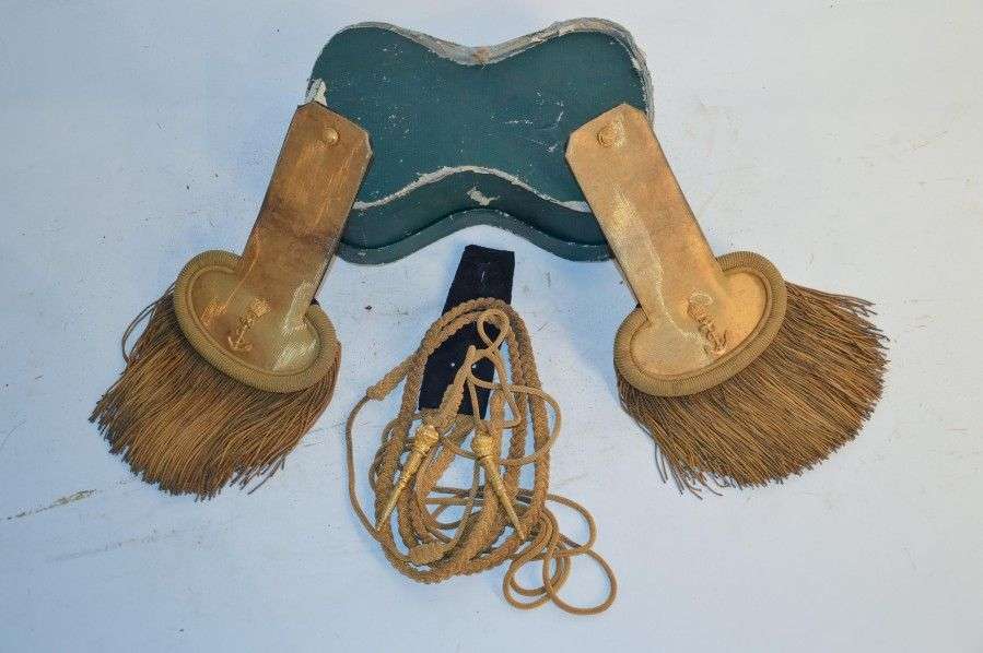 Paire d'épaulettes d'Officier subalterne de la Marine. Corps, torsades, franges, boutons et ancres dorés. Paire d'aiguillettes dorées. Restant de boîte en carton. ABE Époque IInd Empire
