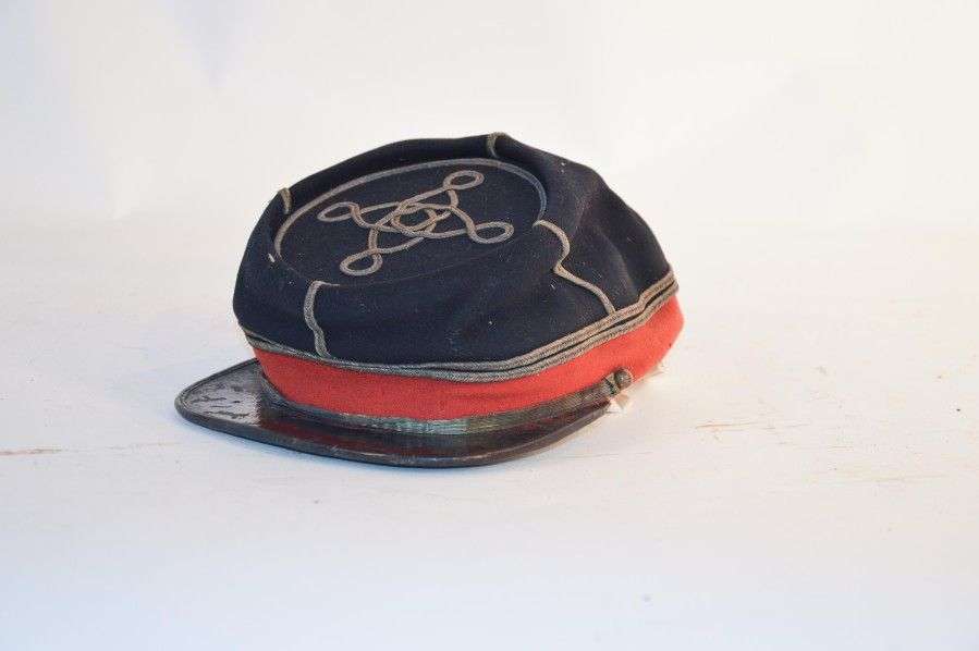 Képi de Lieutenant, en drap noir, bandeau écarlate. Galons, passepoils et fausse-jugulaire argentés. Visière carrée. Coiffe intérieure en cuir et toile. EM Époque IInd Empire (usures et accidents)