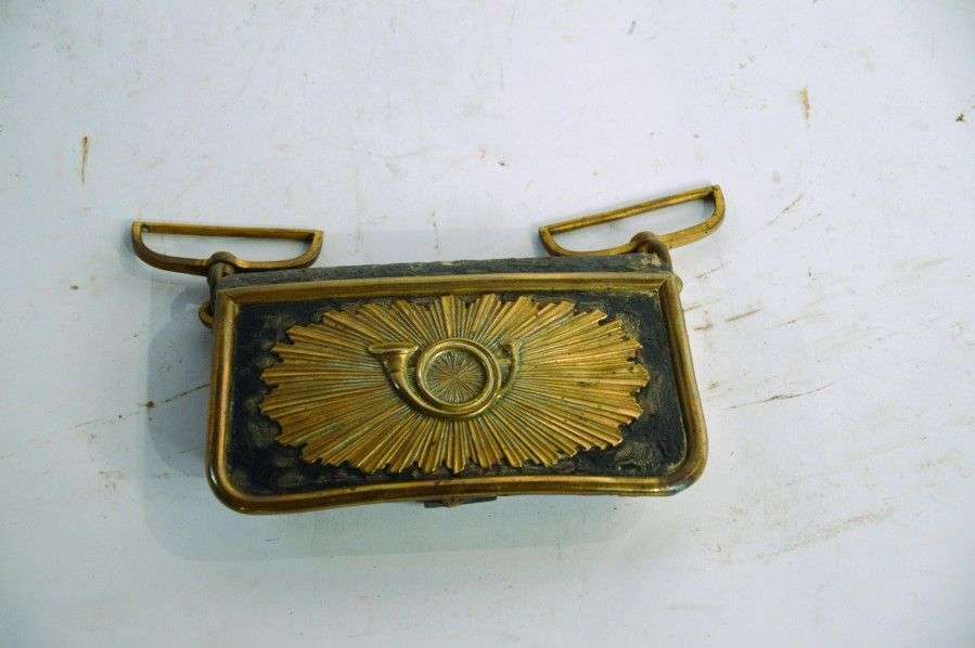 Coffret de giberne d'Officier de Chasseurs à cheval, en cuir. Motif au cor sur fond rayonnant, jonc et cotés en laiton doré. ABE (usures)