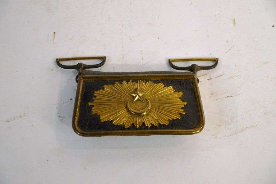Coffret de giberne d'Officier de Spahis, en cuir. Motif au croissant et étoile sur fond rayonnant et cotés en laiton doré. ABE (usures, accident à la patte)