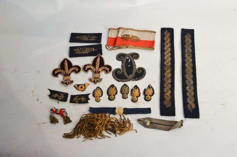 Lot de broderies: brassard d'État-Major, grenades de retroussis, broderies de parements... EM