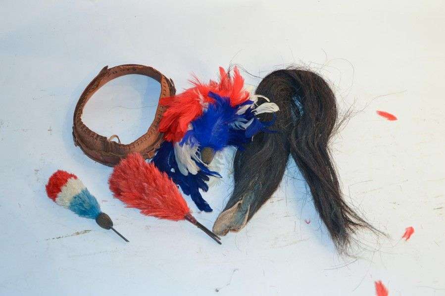 Lot: 3 plumets un écarlate, deux tricolores| restant de crinière en crin noir| coiffe intérieure. Dans l'état
