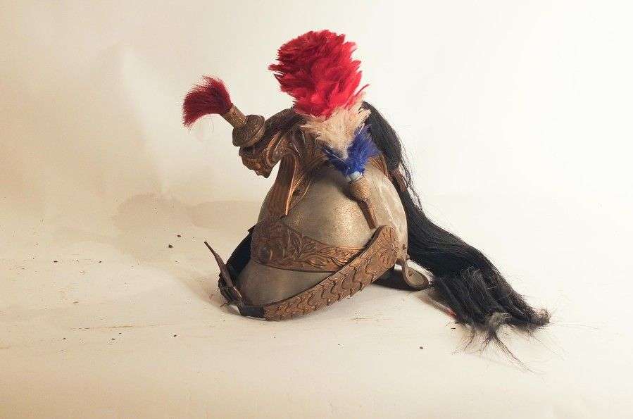 Casque à cimier d'Officier de Cuirassier, modèle 1874. Bombe, visière et couvre-nuque nickelés. Cimier, marmouset, plaque et jugulaires à écailles en laiton doré. Houppette de marmouset en crin rouge. Crinière en crin noir. Coiffe intérieure en cuir. Plumet tricolore à olive dorée. EM (accidents)