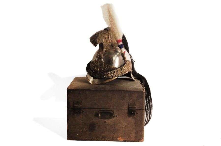 Casque à cimier d'Officier de Dragon, modèle 1874. Bombe, visière et couvre-nuque nickelé. Cimier, plaque et jugulaires à écailles en laiton. Crinière en crin noir. Coiffe intérieure en cuir, doré au fer. Aigrette blanche à base tricolore. Dans sa boîte de transport recouverte façon cuir. BE (usures à la boîte)