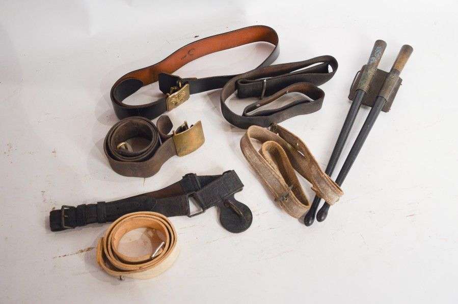Lot: 2 bretelles de fusil, 4 ceinturons, paire de baguettes de tambour. AB