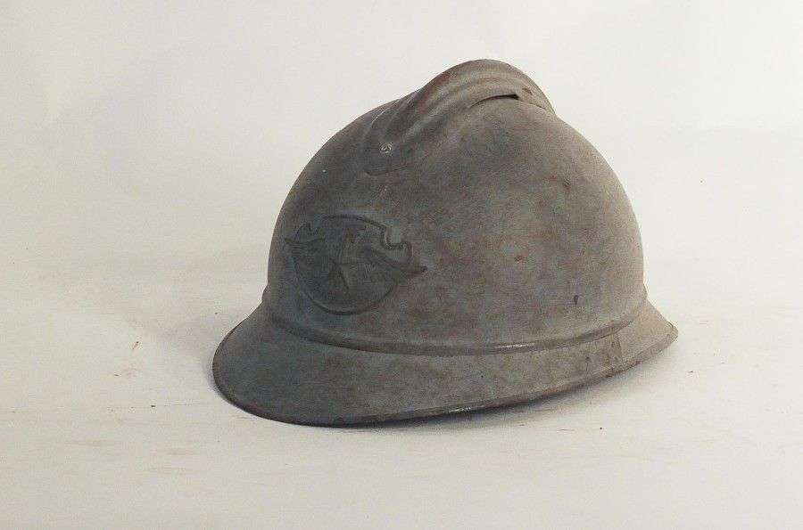 Casque de l'Aviation, modèle 1915, dit Adrian, repeint en gris. Coiffe intérieure et jugulaire en cuir. ABE
