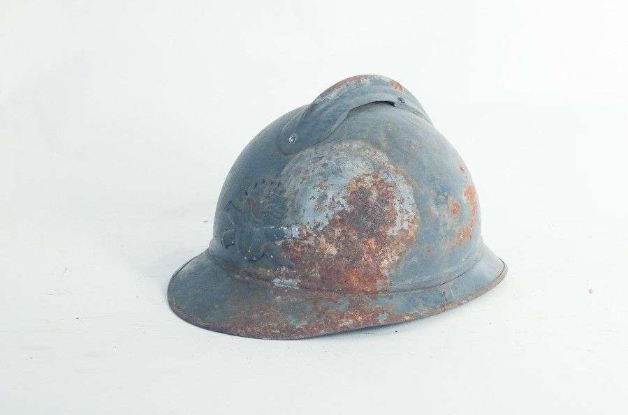 Casque d'Artillerie, modèle 1915, dit Adrian, peint en bleu. Coiffe intérieure en cuir. EM
