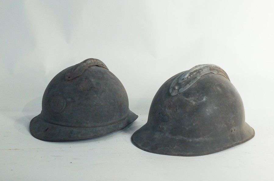 Casque de Chasseurs, modèle 1915, dit Adrian. Coiffe intérieure en cuir. Dans l'état. On joint une coque de casque d'Artillerie 1926