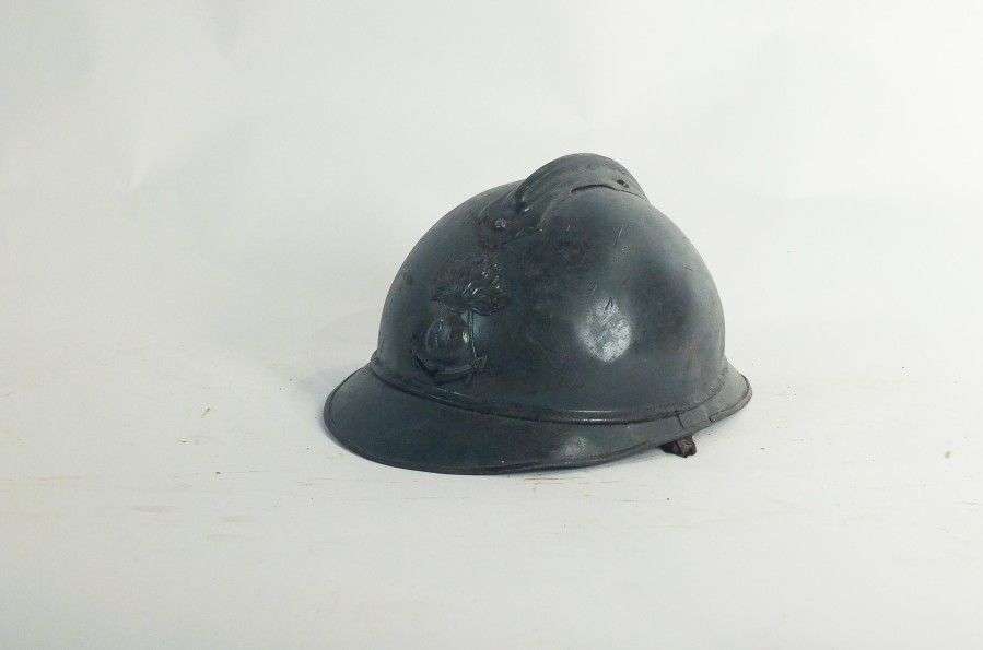 Casque de la Coloniale, modèle 1915, dit Adrian, peint en bleu. Coiffe intérieure en cuir. ABE