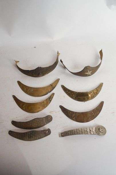 Lot: 2 plaques de casques à cimier| 4 plaques de soldats de la Grande Guerre, 2 jugulaires à fausses écailles| 1 jugulaire de casque de Gendarme. ABE