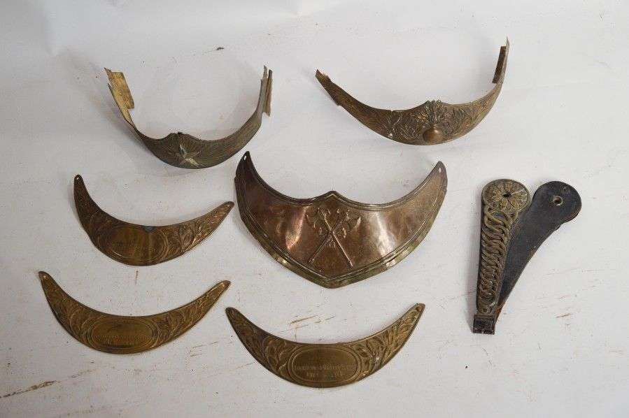 Lot: 2 plaques de casques à cimier, 3 soldats de la Grande Guerre| 1 visière mobile de Sapeur-Pompier| paire de jugulaires à anneaux. ABE
