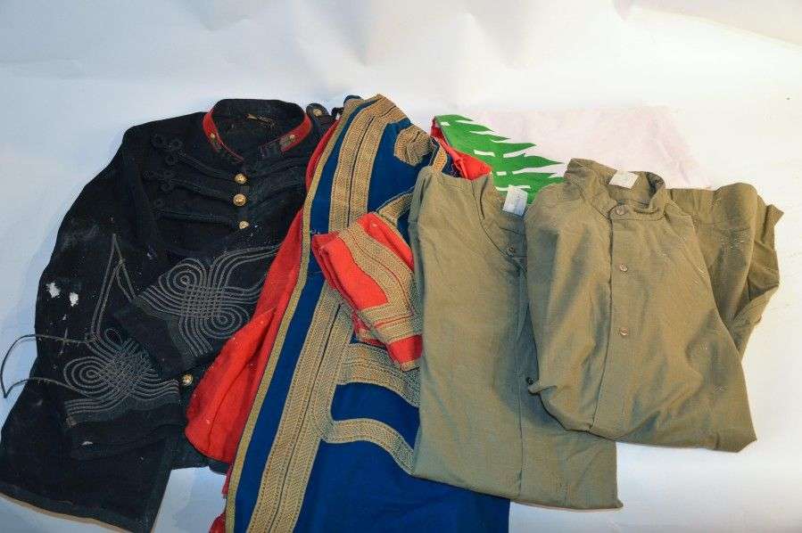 Lot mirifique: costume de laquais| dolman de Commandant du 117è (ME)| 2 chemises kakis| drapeau du Liban