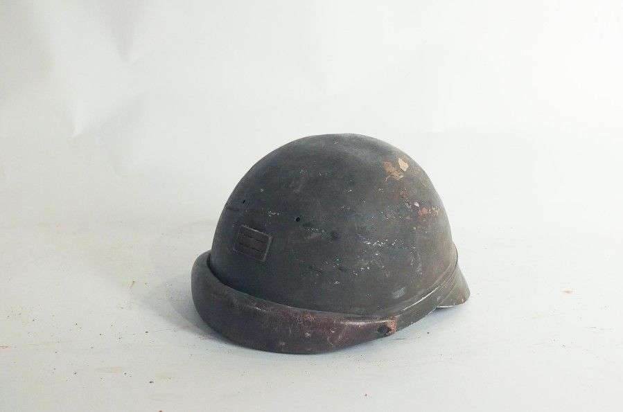 Casque de motocycliste, peint en kaki, avec grade de Capitaine sur le devant. Bandeau, coiffe intérieur et basvolets en cuir. ABE