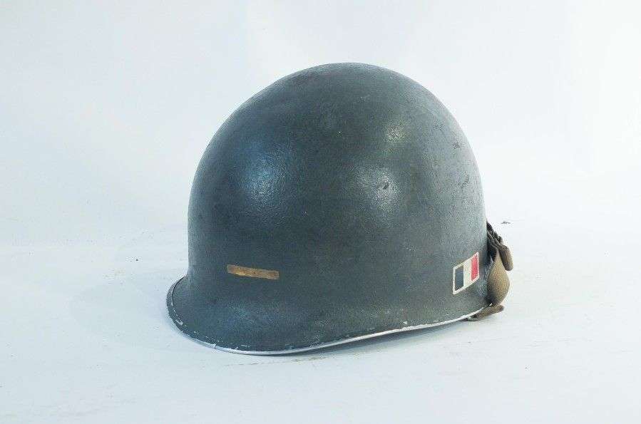 Casque lourd modèle M1, peint en kaki avec barre de grade de Sous-lieutenant et drapeaux tricolores de part et d'autre. Jugulaire en toile. ABE (grade et drapeaux peint postérieurement)