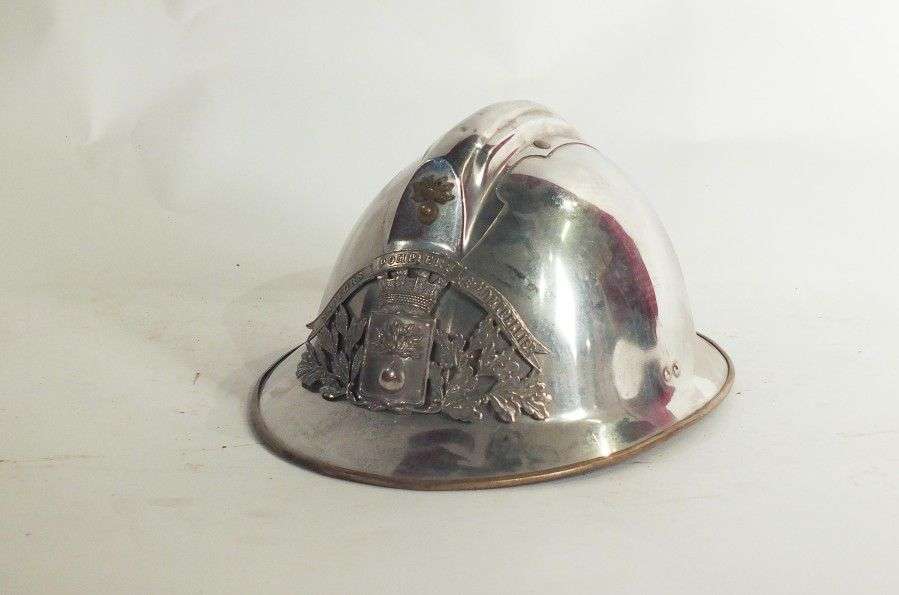 Casque de Sapeurs-Pompiers de Montpellier, nickelé. Coiffe intérieure et jugulaire en cuir. BE