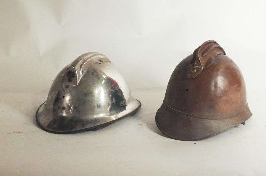 Casque de Sapeurs-Pompiers, nickelé. Coiffe intérieure et jugulaire en cuir. BE (manque la plaque). On joint une bombe de casque modèle 1886 (accidents)
