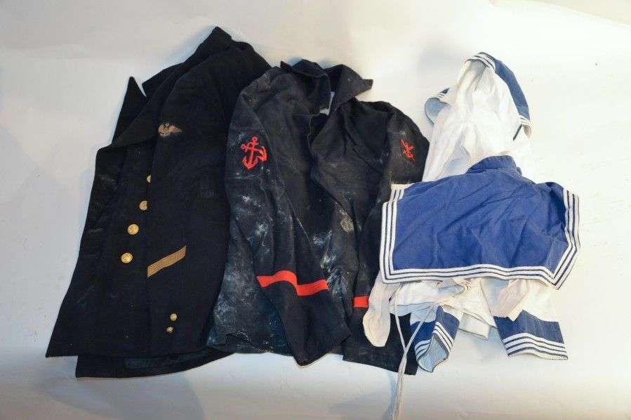 Lot d'uniformes de Marine: marinière blanche, bleue avec col, veste. ME
