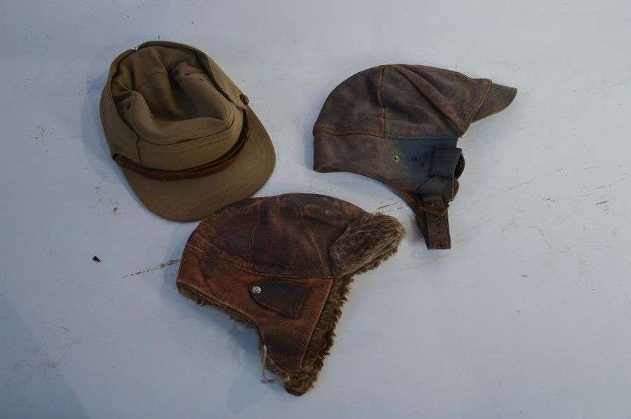 Lot: 2 bonnets d'automobilistes, en cuir| casquette canadienne, en toile. EM