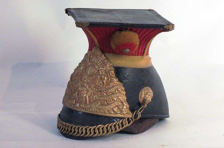 Schapska du 5è Régiment de Lanciers Britanniques. Bombe, visière et plateau en cuir. Pavillon écarlate.