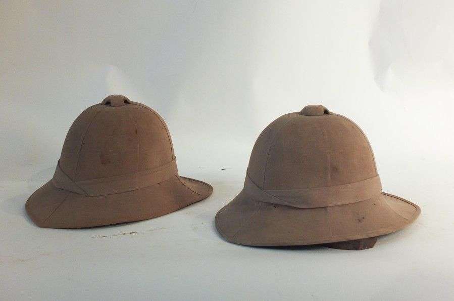 Lot de 2 casques coloniaux britanniques, recouverts de toile cachou. Coiff