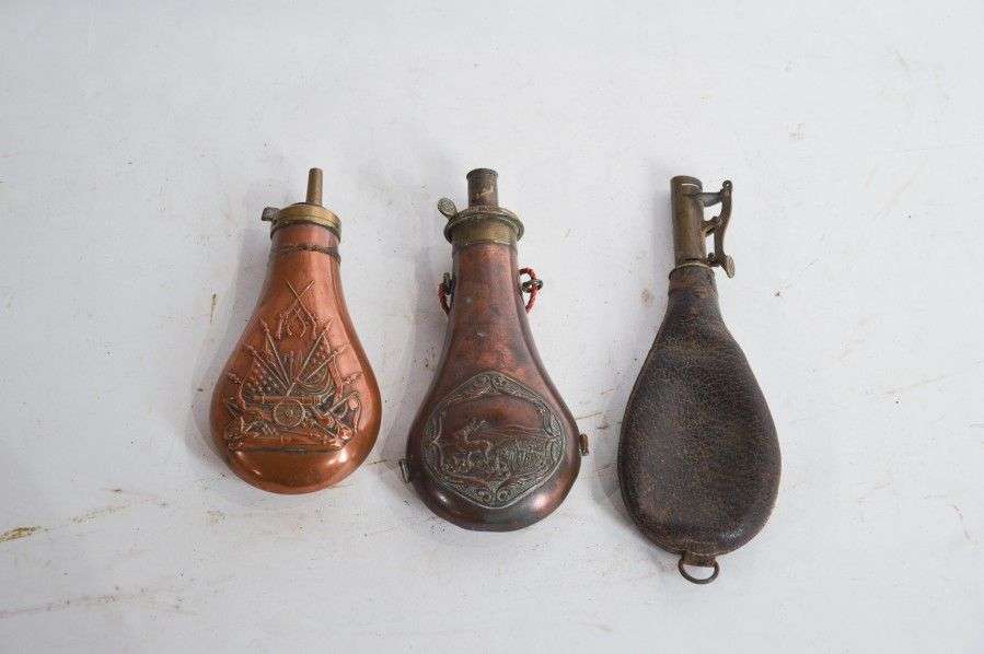Lot de 2 poires à poudre en cuivre, 1 poire à plombs en cuir, dont 1 de fa