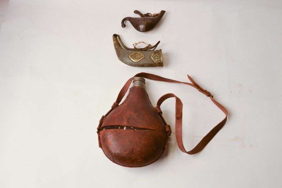 Lot de deux pulvérins orientaux. ABE On joint un bidon de chasse en verre recouvert de cuir