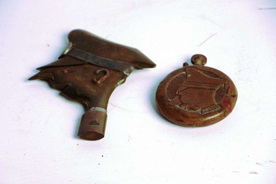 Travaux dit de poilus. Lot de 2 briquets en forme du profil du Kronprinz.