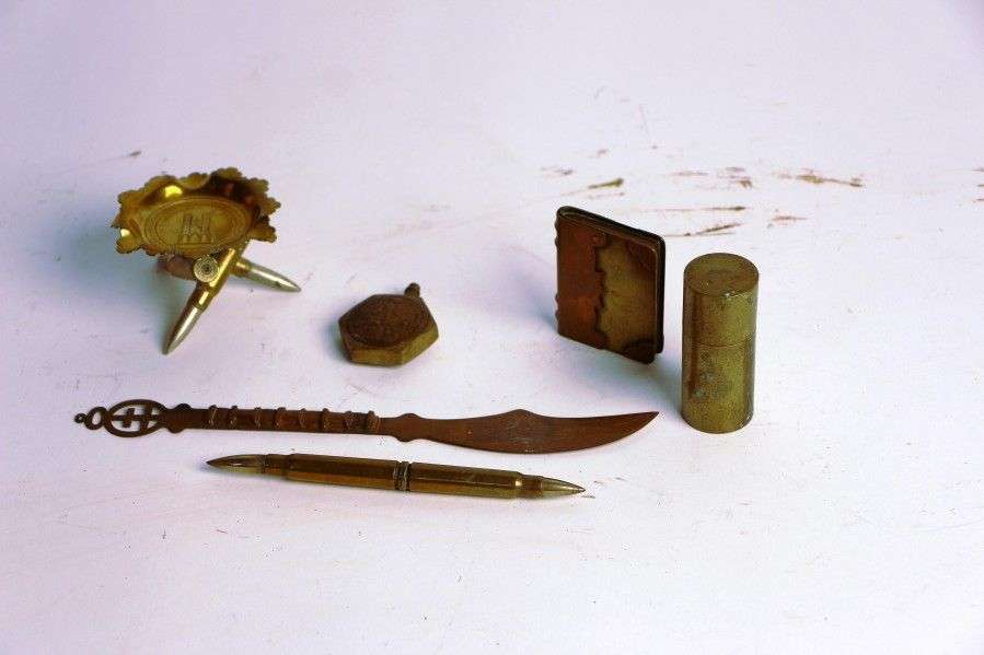 Travaux dit de poilus. Lot: cendrier, 3 briquets, 1 coupe papier, 1 porte plume