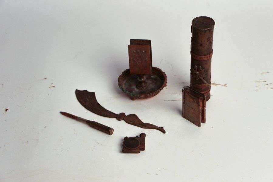 Travaux dit de poilus. Lot: cendrier porte-boite d'allumettes, 3 briquets, 1 coupe papier, 1 porte crayon