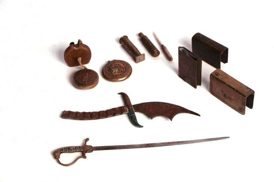 Travaux dit de poilus. Lot: 4 briquets, 2 coupes papier, 1 cachet, 2 protèges boite d'allumettes